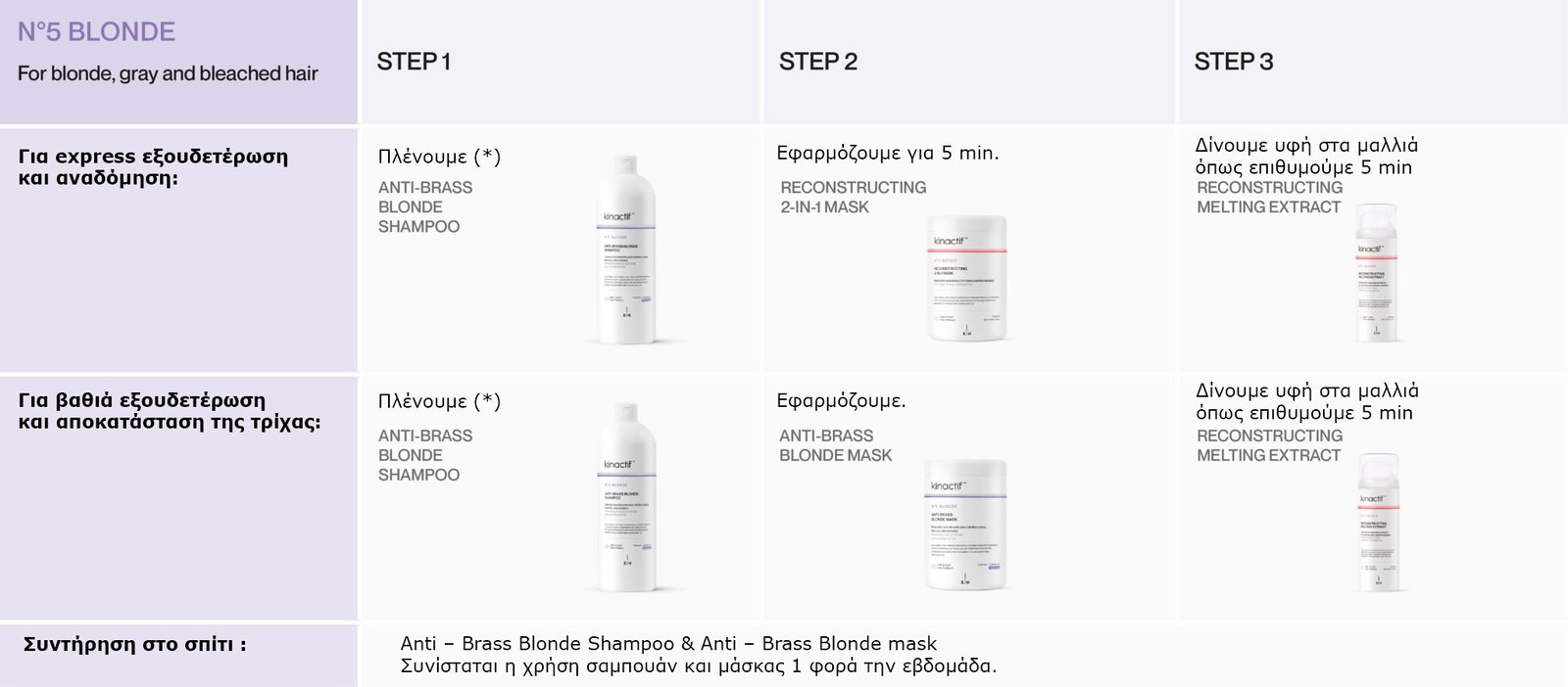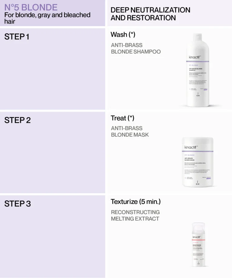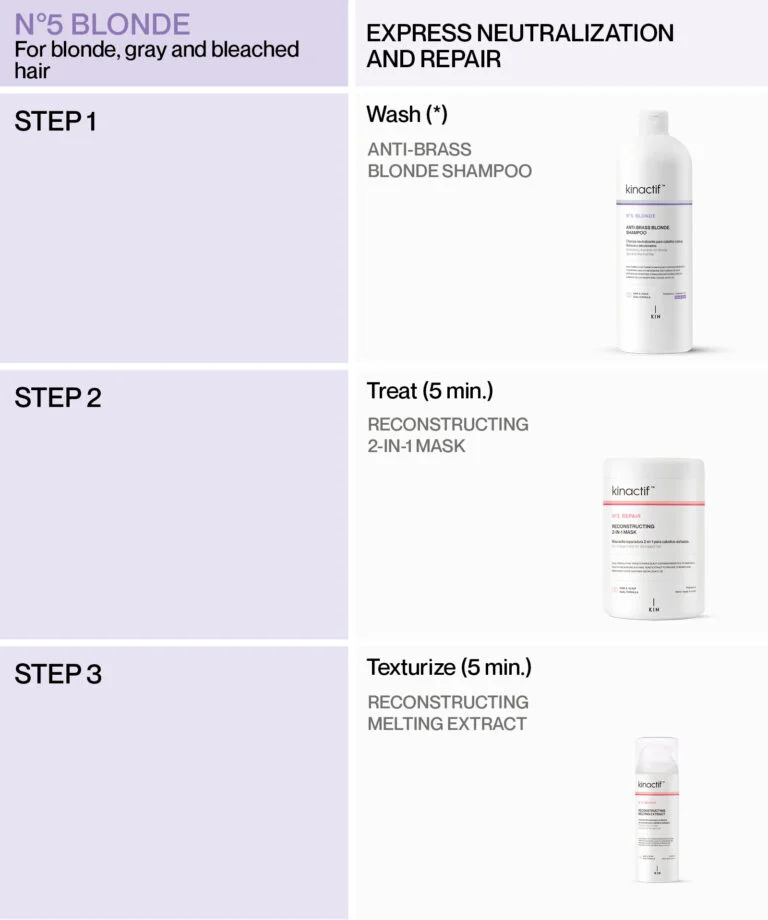 Το KINACTIF™ N°5 BLONDE εξουδετερώνει ανεπιθύμητους κίτρινους υποτόνους, προσφέροντας ψυχρή λάμψη και επαναφέροντας τη χαμένη φωτεινότητα, ενώ αποκαθιστά την απαλότητα της τρίχας.