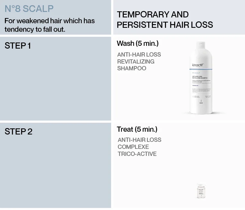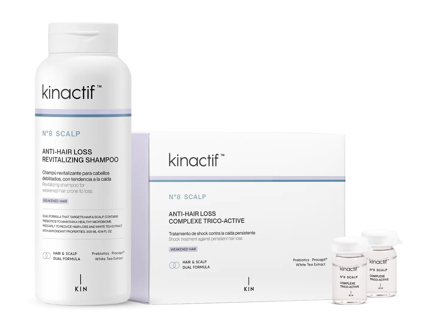 Τα προϊόντα KINACTIF™ N°8 SCALP ANTI-HAIR LOSS δρουν στα εξασθενημένα μαλλιά, μειώνοντας την τριχόπτωση, αυξάνοντας την πυκνότητα και ενισχύοντας την τρίχα.
